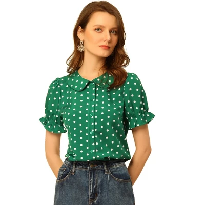 A doll collar and puff sleeves add ebullient charm to this vintage shirt. Polka dots put a romantic frame around this shirt with a turn down collar. Suitable for casual, work, school, dating, weekend gathering, holiday and daily wear. Lovely polka dots and a Peter Pan collar bring casual romance to a sweet shirt. This elegant and cute blouse, designed with a doll collar and puff sleeved, adds a touch of elegance and cuteness to your wardrobe. This sweet shirt is easily paired with short skirts or trousers for a retro and sweet look.