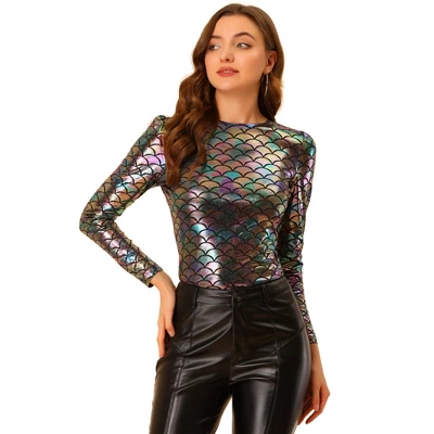 - Metallic Shiny Tops, Puff Sleeve, Crew Neck