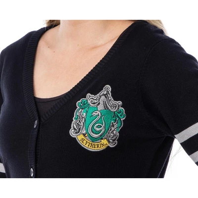 - SLYTHERIN HOUSE CREST CARDIGAN – This Harry Potter Slytherin open-front cardigan has the house crest stitched on the chest. A varsity-style black sweater with gray stripes at the sleeves and waist. Six buttons are located on the front of the cardigan for closure