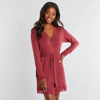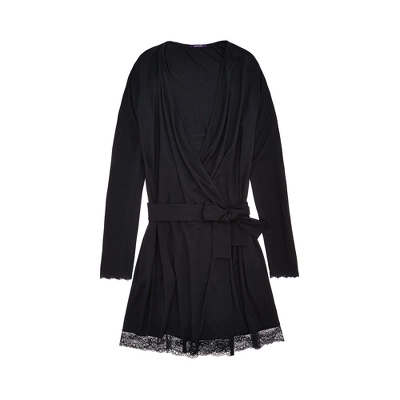 The chic wrap-style Emma Robe from Journelle practically demands breakfast in bed with its cloud-soft construction and luxe lace-trimmed look. Designed in a short fit with an open front and made of ultra-soft midweight fabric with a perfect hint of stretch, this short robe makes a great go-to choice for lounging at home, for relaxing travel, or anytime you want to look glam before you even get dressed. A wide self-tie waist belt lets you adjust your fit to wear this chic short robe open or closed, and scalloped lace detail along the bottom hem completes the luxurious look.