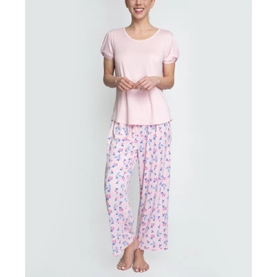 This feminine sleep and lounge set is made from our #1 bestselling fabrication, cloud knit. Cloud knit is soft, stretchy, drapey and silky. Its also lightweight and super comfortable. This set features a deep round neckline, tiny and feminine ties at the sleep and an open leg pant. The pant is cropped- a 25″ leg
