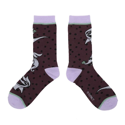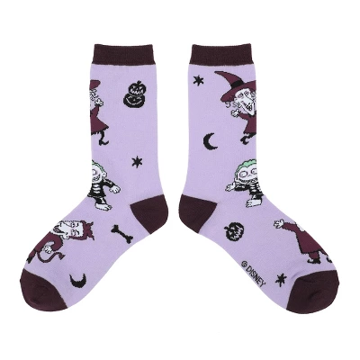 Add some nightmarish fun to your wardrobe with these officially licensed Nightmare Before Christmas womenās classic crew socks. This 5-pack of socks features five purple and black custom designs that channel your favorite holiday movie and are perfect for adding some fun to your everyday wardrobe. Crafted from high-quality polyester (98%) and spandex (2%), these socks are not only comfortable but also durable. With a sock size of 9-11 and shoe size range of 5-10, they’re designed to fit most adult women comfortably. For easy care, simply machine wash them in cold water with like colors, and you’ll be ready to celebrate the season in style.